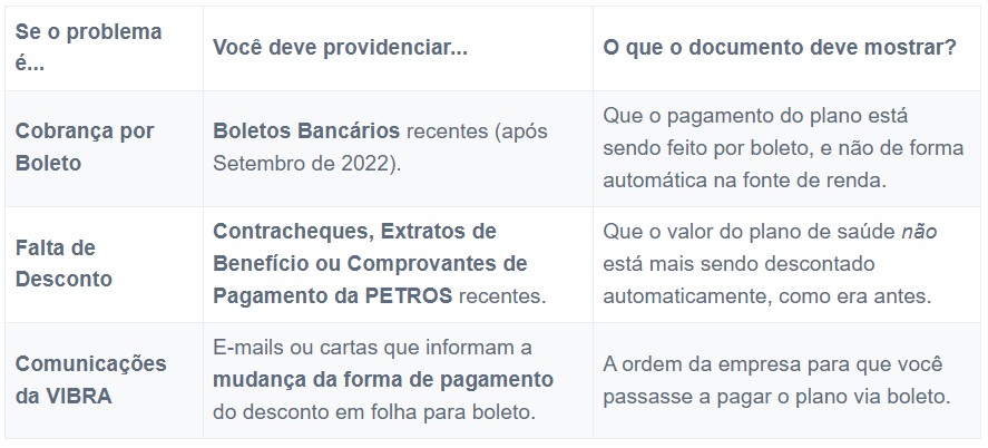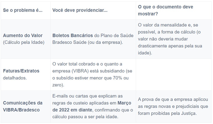 Você deve separar os documentos mais RECENTES (de 2022 em diante, especialmente após Setembro de 2022, data da liminar inicial), que provem que a empresa está cobrando o plano de saúde de forma diferente das regras antigas.