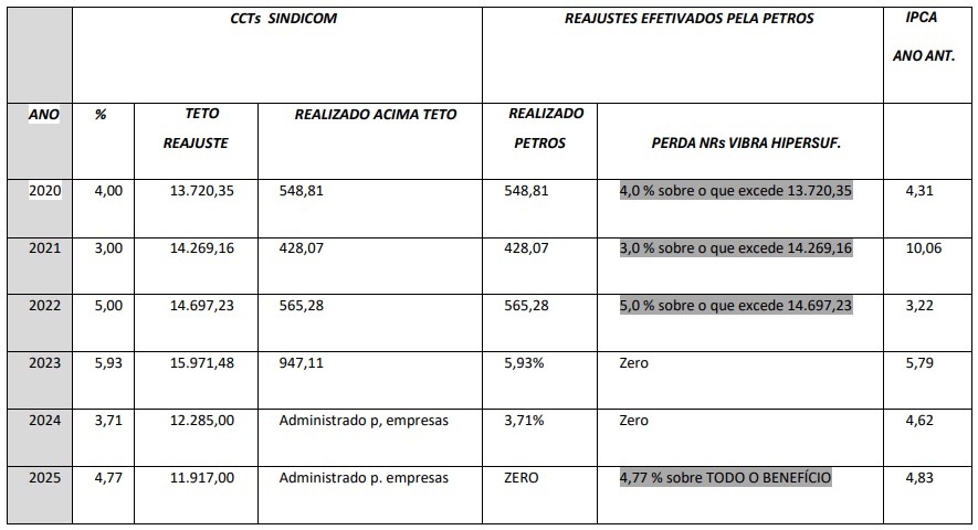 E aí vem a má fé da Vibra: em 3 dos 6 anos em que se celebraram CCT, ela só recomendou, e a Petros concedeu, aos aposentados equivalentes aos hipersuficientes, o reajuste mínimo, até o teto. O que excedia esse teto, ficou sem correção. Somente em dois anos, a Petros aplicou o reajuste integral, correspondente ao índice estabelecido na CCT.